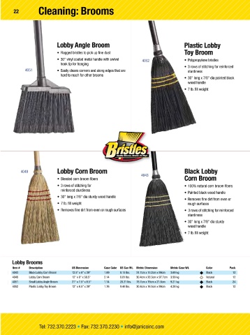4051 Small Lobby Angle Broom 31" x 7.5" x 8.5" 1.14 20.31 lbs. 78.7cm x 19cm x 21.6cm 9.21 kg Black 24 4046 Janitor Corn Broom 20" x 9" x 57.5" 5.99 25.25 lbs. 50.8cm x 22.8cm x 146cm 11.4 kg Natural 12