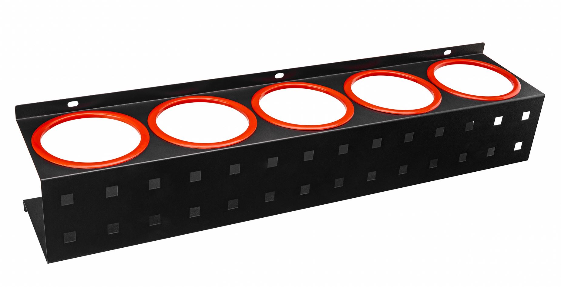Wall-mounted spray bottle holder with 5 bottle holes and 5 hanging hooks.